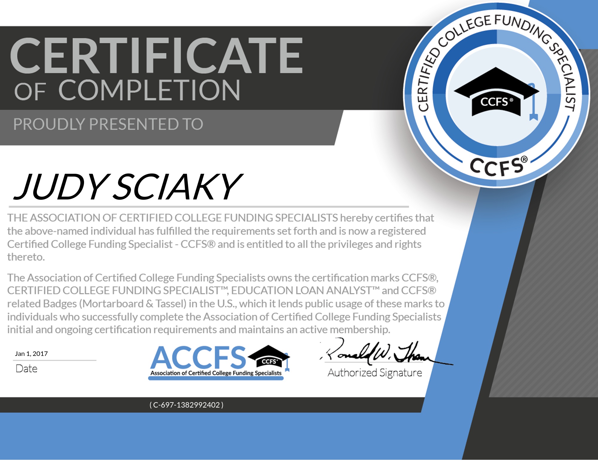 The CCFS® certification mark identifies college financial professionals who have met the high standards of competency and ethics established and enforced by the Association of Certified College Funding Specialists.
